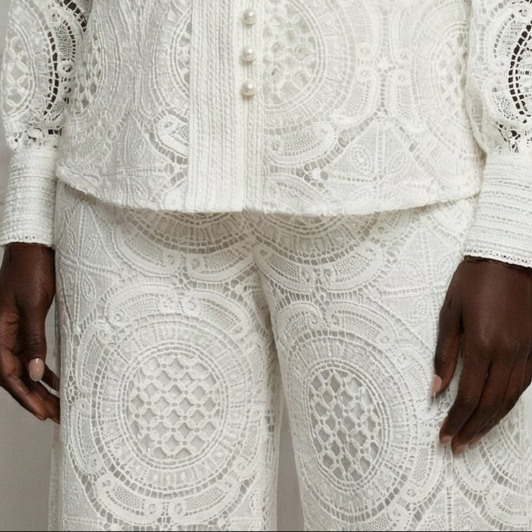 Delicately patterned lace and tailored drape leg give the Amara Lace Pant its quiet sophistication, made to elevate the everyday. Designed for women who value beauty without excess. Breathable fabric lining. Rear zipper closure. Dry clean only.
